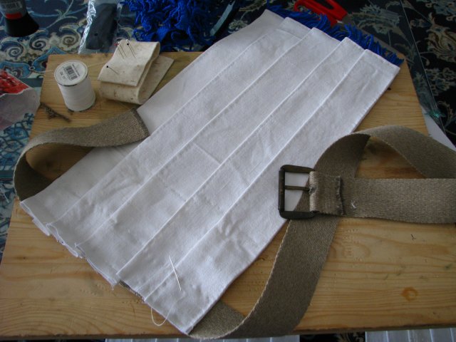 Pic.20-21. Left: sewing the white pteryges with the fringe. Right: final assembly on the linen belt.