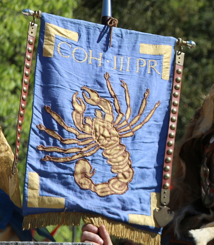 Fig.4 - Il vecchio vessillo in uso dal 2004 al 2018 nella Cohors III Praetoria (Associazione Culturale Cisalpina) con le due cravatte in cuoio borchiato. Oggi custodito presso una collezione privata.