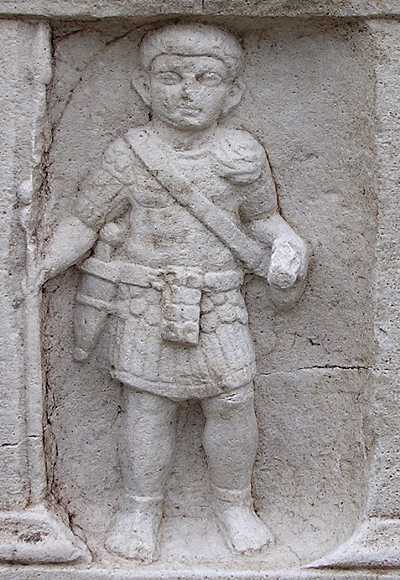to the image of the soldier, reports the soldier's name "MON(?)US (?) CAPITO" and his career status of an Optio, that was in service