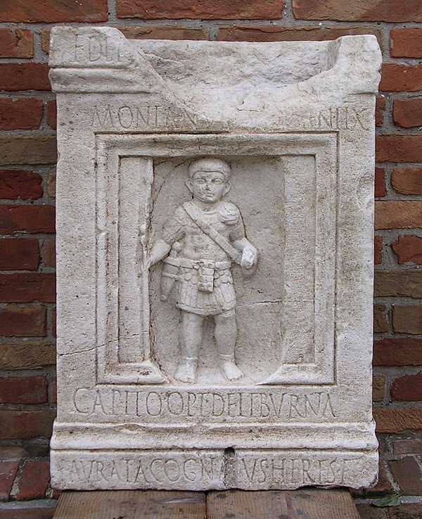 on a liburna, a small ship used for recognitions and to fight pirates, called AURATA (golden). The monument was commissioned by Cocneus,