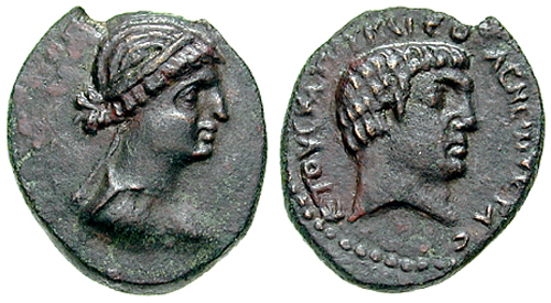 A coin with Cleopatra (left) and Mark Antony (right)