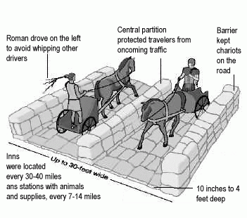 There were inns every 50 to 64 kilometers (30 to 40 miles), and post stations, the Roman equivalent of gas stations, every 11 to 23 kilometers (7 to 14 miles).