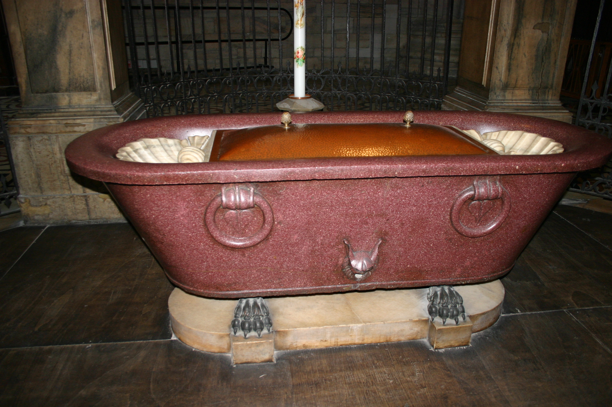 Ancient Roman bath-tub in egyptian red porphyry, transformed into the Baptismal font of the Cathedral in Milan, Italy.