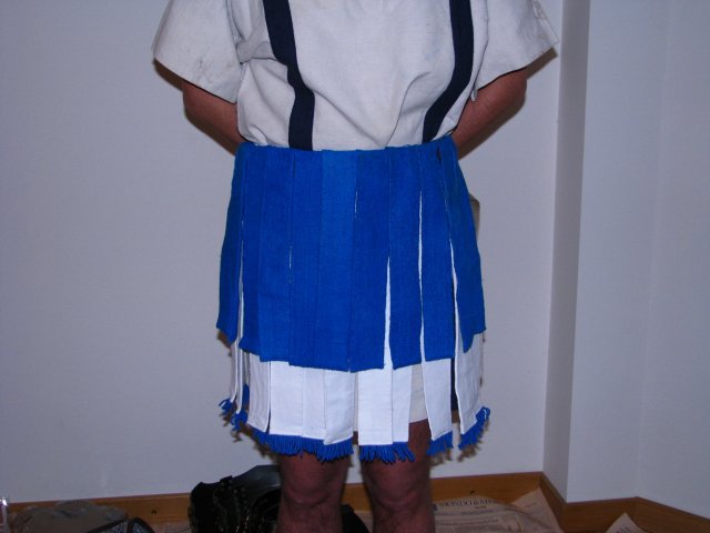 The second row of pteruges, the longer one, is white in order to create more contrast with the blue row. This row is with fringes in the terminal part. The final assembly is done attaching the pteruges to a thick linen belt.