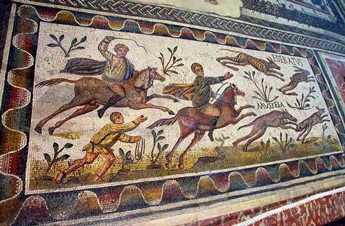 Fig.14 - Uno schiavo con Clavii assiste i padroni a cavallo nella caccia. Mosaico del II sec. d.C. nei pressi di Tunisi