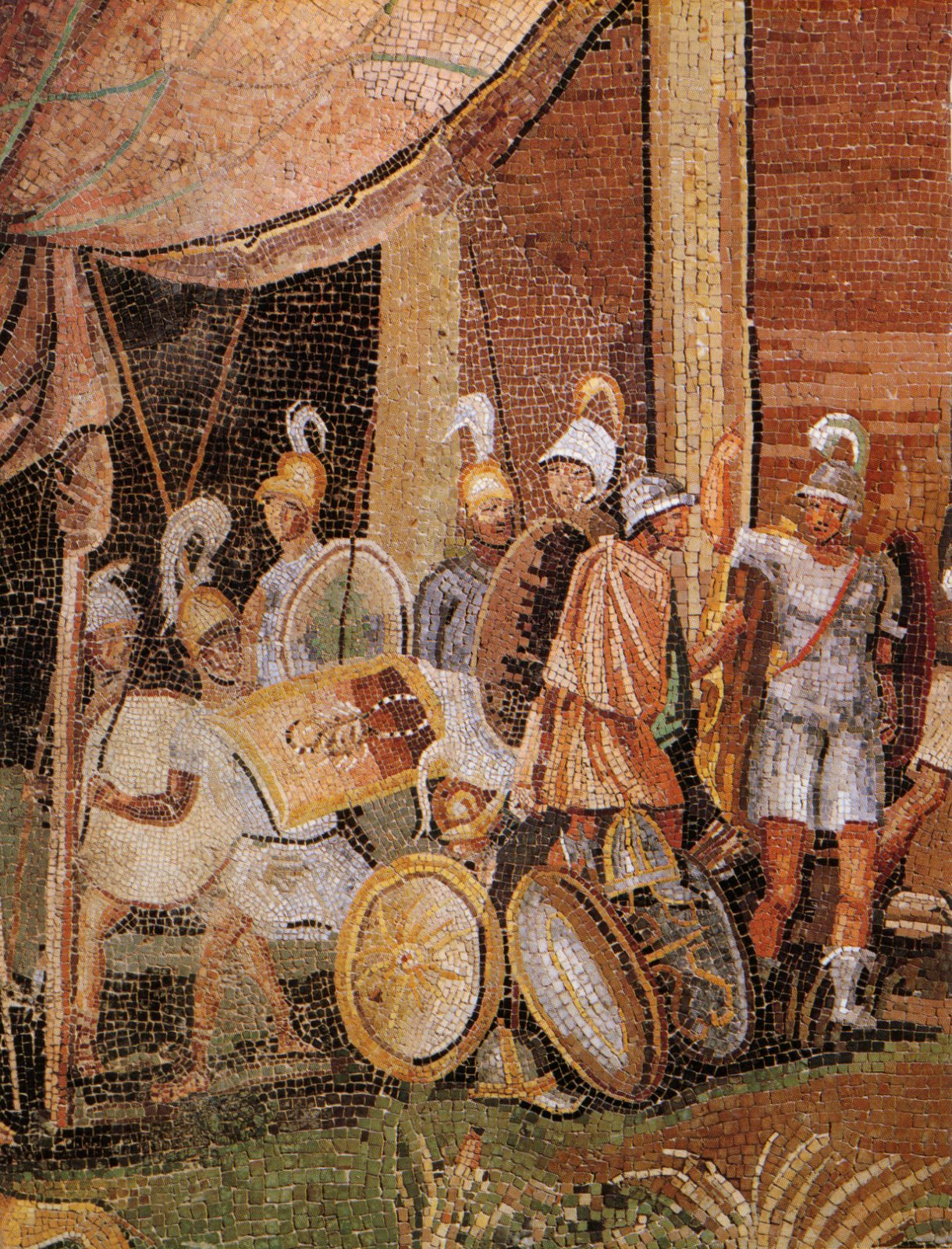 As example, the famous Palestrina mosaic (Figure 1) which depicts presumably soldiers of the Pretoria Guard because of the shape of a scorpion on the shields wearing a white tunic under the usual armor. This is one of the clearest "color" evidences of Roman military clothing.