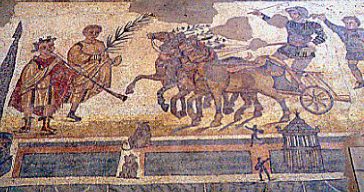 Fig.13 - Il musicante (prima a sinistra) mostra i Clavii. Mosaico del III sec. d.C. a Piazza Armerina.